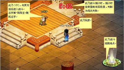 地图中间的那老头是阵法的阵主,进入阵法得先把他打败。五分钟为最长时间,如果你在五分钟之内战胜就会自动进入下一关;如果战败则为挑战失败。同样,五分钟之后你还没未成功但是也没失败,系统自动判定你为失败。