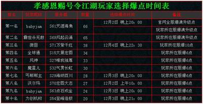 而“babyjam”也已经迫不及待地确定了使用号令江湖令牌的时间,就在昨晚20:00,已经给全服所有玩家爆满店铺升级点,而其他的9名玩家则大都把爆点时间集中定在了今、明两天,赶紧去登陆游戏看看吧,以外的惊喜在等着你呢!