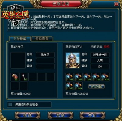从远古以来,在恩塔瑞格大陆四族长老间,流传着一个传说。众神为了在下界选择代言人,设下一个考验——“魔幻之塔-巴别”。前去挑战成功的英雄都成为历史上最杰出的人物,即使没有挑战成功,那些幸存下来的挑战者也都获得了许多无法描绘的宝物。对宝物的渴望和对众神的向往让巴别塔就像一颗投进池塘的石子一般,引得大陆各方势力纷纷出动。而原本隐藏在黑暗中的一股神秘势力也开始出现在众人面前。在《英雄之城》九月版中随着“千年之塔-巴别”的出现,玩家即可参与挑战,巴别之塔共40层,由不同的敌人防守,每成功挑战一层,才可选择是否进入下一关。挑战中每层的奖励将会累积,若挑战失败,则前面累积的奖励均无法领取。10关可以获得一件随机的30-40级装备,20关可以获得一件随机的40-50级装备,依次类推,获得装备至少为3属性。每关还可以获得大量的经验奖励,每个玩家每天可访问1次,如果愿意多付出一点,巴别塔将为可开启3次。此外,玩家除了每天的发展,经营,战争以外,还可以参与到野外的BOSS战中。每天3个时段,大地图上将会出现BOSS的爪牙,每次刷出20个左右的爪牙。玩家需要把所有的爪牙全部消灭之后BOSS才会出现。BOSS将会掉落70左右的装备。正是由于这些纷沓而至的BOSS挑战,保证了玩家在《英雄之城》中的每一秒都能玩得过瘾玩得充实。