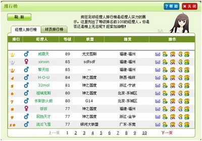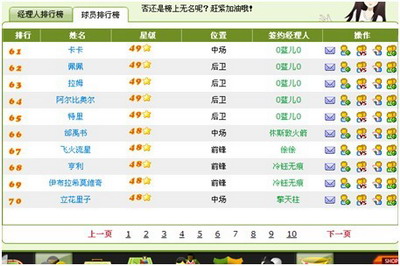 作为《疯狂足球》的英雄榜,排行榜反映了球坛里的风云人物,是玩家最高的荣誉所在。排行榜包括经理人排行榜和球员排行榜,它们分别反映足球经理人的等级排名和经理人拥有球员的星级排名。此外,这些排名是变动的,谁的实力提高了谁的排名就向前靠,在这仅有的百名排行榜中,谁能榜上有名就要看谁有更强的实力了。