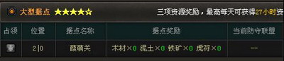 据点共有王者至尊(王者)、葭萌关(大型)、长江畔(中)、定军山(中)、三江口(中)、卧龙岗(中)、七星坛(中)、落凤坡(中)、濡须口(小)、神亭岭(小)、银坑山(小)、逍遥津(小)共12个,开服之后,连续占领其中任何一个据点9天,即产量*9时,由联盟负责人通过QQ提交截图给官方公会管理人员,经过官方工作人员查证后,该联盟所有成员都可以获得一份丰厚奖励。