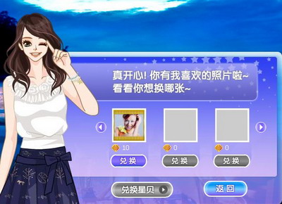 拿到修复好的照片,就可以去兑换成“星贝”了,注意哦,明星闪卡的等级不同,兑换到的“星贝”数量也是不同的,等级越高,越值钱!当然收集的难度也会很大,每天多留意一下跳蚤市场,不要错过任何一个机会!小弟逛了很久,才凑齐了一张等级1级的明星闪卡,漂亮的美眉兑换了10“星贝”给我,不知道能买到什么呢!走吧,去“星贝集市”逛逛!