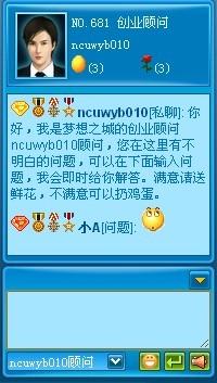 游戏增设一个聊天频道,玩家可以在聊天室内找到在线的创业顾问进行对不理解的事务咨询,寻找合适伙伴,闲聊热点话题等等。当然,你如果对他满意的话请不要吝啬鲜花,觉得不满也可以扔鸡蛋投诉,鲜花和鸡蛋是对创业顾问的成绩考核。