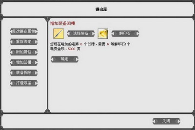 装备打孔=需要打孔的装备+解印石+金钱 (随着孔的增加,打孔所需的金钱也会增加。)在锻冶屋,可以进行增加凹槽。