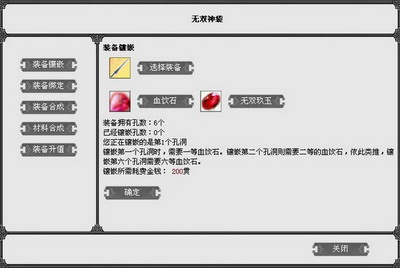 使用无双神袋和无双玖玉、孔数所对应等级的血饮石进行装备镶嵌。镶嵌出来的装备=带凹槽的装备+无双玖玉+孔数所对应等级的血饮石+金钱(不同等级所需的金钱也不同)