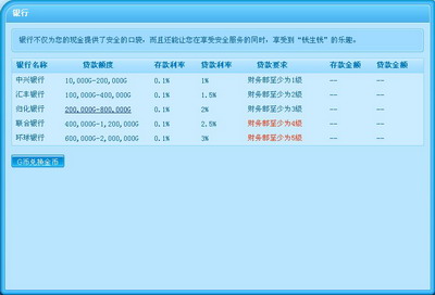 游戏中有5个银行提供给玩家选择,不同的银行有不同的贷款要求和利率。