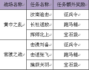 12月11日至18日期间,玩家只要在10级和10级以上战场,完成对应的支线任务,将可额外获得特殊宝物奖励,能募集军队的征兵令,能提高速度的跑马箱,能强化属性的宝石袋,让您在征战的同时更多一份收获,同时战场疯狂一周,战场获胜您可获得更多的战场勋章,使用援军令,可以换取勋章盒,不同的战场勋章可以直接换取战场军备箱,运气好打开可直接获得战场蓝色品质套装哦!
