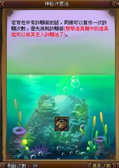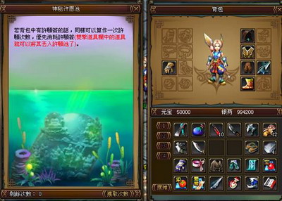 点击许愿池,出现许愿界面,同时会打开背包。双击背包中的物品,将其投入许愿池,如果物品浮出水面,表示许愿成功,新的物品会自动放入背包;如果失败,道具沉入水底消失。