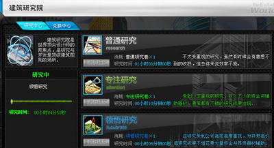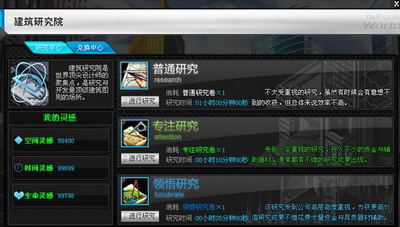 在建筑研究院里通常有三种类型的研究供您选择:普通研究、专注研究、领悟研究。参加了其中的一种研究都有机会得到一定的空间灵感积分,但并不是每次的研究都会得到积分,而且得到的积分数也是随机的!不过小编在这特推荐领悟研究,相对起普通研究和专注研究,领悟研究所得积分会相对多点。