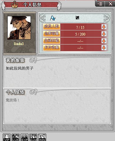进入游戏,点开【个人信息】就可以显示出你自己的基本资料;包括成员人数,仓库容量,生活技能和卡片收集数,另外有大大的窗口可以显示我的故事和个人成绩。其中我的故事可以自己填写,并且可以被别人查看到哟。个人成绩则由系统自己加入,如果你能在本服的排行榜上取得名次,就会保留在你的履历里,永不消失哦。