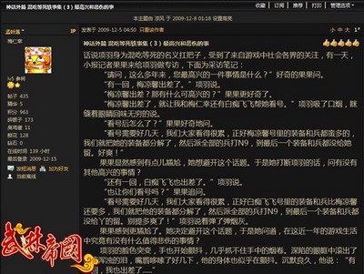 话说项羽(玩家名)身为混吃等死(联盟名)的名义扛把子,受到了来自游戏中社会各界的关注,有一天,小报记者果果(官方论坛管理员)来给项羽做专访,下面为采访笔记: