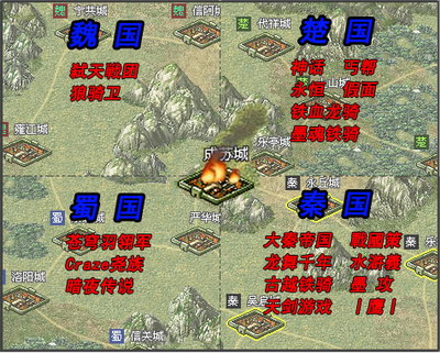 该盛事对于公会而言,不仅是一场体现公会荣誉,对其团队协作、谋略管理及实力等综合考验的比赛,更可以通过比赛让全中国玩家见识到各公会实力,扩大本公会的影响力,以利于日后吸收新鲜血液、壮大公会。目前报名参战的十余家公会已确定所选国家,公会进驻魏、楚、蜀、秦四国家方位图如下: