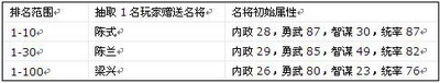 2.排行榜前100名的玩家当中更会随机抽取3名玩家,赠送三国唯一名将1个。