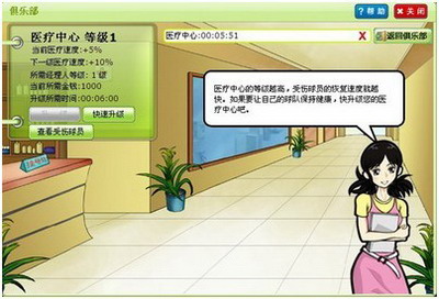 当然,球员受伤还是会发生的,那么,在球员受伤后就要采取措施来帮助受伤球员。《疯狂足球》俱乐部的医院是受伤球员得到及时治疗必不可少的设施,医院的等级越高,球员恢复的就越快,所以医院是不可或缺的。