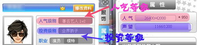 等级名称:人气提升后,玩家会有相应的等级名称,最开始大家都是“龙套级别”,之后会逐步变化。具体等级名称可以点击菜单栏的“艺人库”查看。等级名称从低到高分别是“龙套——签约艺人——闪亮新秀——知名艺人——著名艺人——人气偶像——实力明星——当红明星——超级明星——天皇巨星”。
