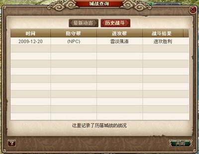 关乎帮会荣誉与王城得失的攻防拼杀,需有雄才大略方能取胜。攻击方必须在打倒场景内NPC后再将王座建筑打下方可取胜,而防守方要想方设法阻止攻击方。攻击方可在帮会商店中购买攻城道具“铜砖”及“铁砖”,在攻击建筑时,包裹中持有这两种道具,将每次分别增加额外2点和5点的建筑伤害值,每次消耗一块。同时攻击方还可以购买“杀将锦囊”,在攻击战场内NPC时获得50%的伤害增加!终极对战的攻防拼杀,将是对玩家们才略的最大挑战!
