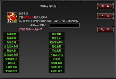 每次开启前需要输入一个玩家的昵称(不能是自己),开启后获得奖励,圣诞老人礼包将按照您输入的昵称传给这个玩家。接到礼包的玩家可以继续开启,直到开完第10次礼包消失。
