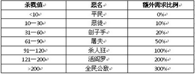 玩家们把鼠标移动到游戏界面左上方的“恶名”,就会显示玩家当前的杀戮值、征兵价格和产生时间的比例情况。在非随着玩家们攻击对方玩家的次数越来越多,杀戮值就会自动提升。玩家PK同等段或者更高等级段的玩家不会增加杀戮值。PK比自己等级要低的玩家将会以1点为单位逐步提升: