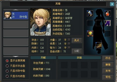 英雄有攻击,防御,内政3类英雄。根据不同英雄加不同点,攻击全加力量,防御全加体制,内政全加智力。根据你主出的兵选择你要主练到英雄的攻防。
