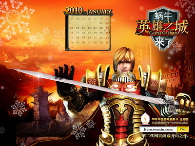 2009年最火爆的网页游戏《英雄之城》自上线以来,以其精美的画风,高水准的画质,丰富的游戏性得到了广大玩家的喜爱,并荣获了09年中国游戏奥斯卡——金翎奖之“玩家最喜爱的十大webgame”。在这辞旧迎新之际,为回报广大玩家的厚爱,蜗牛特制作了一套《英雄之城》虎年1月人族月历桌面提供给热爱这个游戏的英雄迷们,一共有三种尺寸,适合不同显示器。