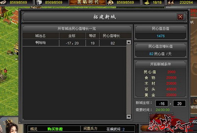 在《决战天下》里,要开辟一座分城,需要粮食、木材和黄金三项资源各2万,石头需要达到4万以外,开辟第一座分城需要民心2000;而要开第二座分城,民心则需要16000之多.所以开辟分城,人心,资源一个都不能缺.资源方面要加强抢夺力度,最原始也最有效的办法就是不断地攻打野外NPC和抢夺其他玩家的资源.为了自己的子民和城池,不知道抢夺有"礼"的帝王,永远都做不了好的帝王.另外在民心方面,就是要做好每天5个的日常任务了,这样日积月累,才能让子民对自己心悦诚服,永远效忠自己!