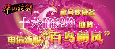 2010年虎虎生威的到来;大家都沉浸在这片喜气的海洋里,在过去一年里《华山论剑》以其精良的游戏制作、精美的游戏画面和精彩丰富的玩法不断受到玩家们的认可和支持,老服人气不断高涨,新服也在应邀而不断加开,场面极具壮观。2010新年的到来,为了让更多玩家享受畅快的游戏体验,《华山论剑》于1月11日11:00开启电信新服“百鸟朝凤”,为玩家们呈现全新的武侠世界。