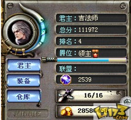 首先介绍的是游戏的界面,先从左边开始。此界面显示的是君主的属性数据,武器装备,排名先后,爵位,声望,游戏宝石,运输舰,和金币。