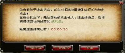 打怪的时候可以选“击杀”或者“连杀”,前者是每次打一个怪,可以看战斗过程;后者就类似于挂机式的自动打怪,一次最多可以自动打30只怪,但是“连杀”每只怪所需要的时间比“击杀”每只怪所要花的时间长多了。