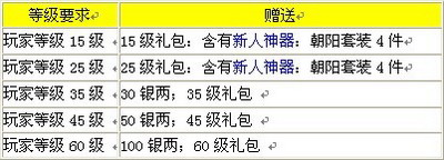 新手玩家进入《明朝时代》不必担心没钱没装备,每达到一定级别就会赠送相应的装备和银币,让你轻松玩转《明朝时代》。