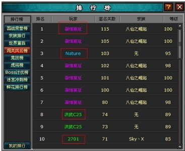 注:闯关必须留名才能在『闯关风云榜』显示,请玩家务必留意!签名重复则取排名最前的名次,每个玩家只能领取一次闯关排行榜奖励,不能重复获得。