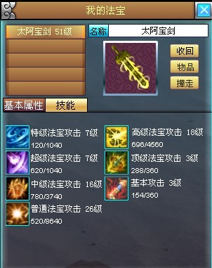 法宝无字天书:用来给法宝打造技能的必需品。玩家在打开无字天书时,将有一定几率随机获得普通法宝攻击技能书、中级法宝攻击技能书、高级法宝攻击技能书、特级法宝攻击技能书、顶级法宝攻击技能书、超级法宝攻击技能书等其中一本。