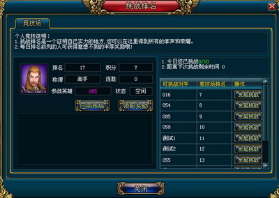 一、点击竞技场中的“挑战排名”按键,弹出界面如下: