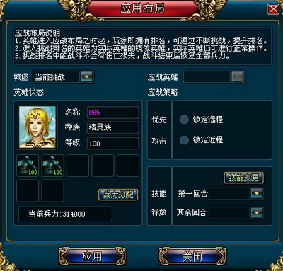 玩家可以选择进入挑战系统的英雄。再进行兵力分配及应战策略调整后,点击“应用”后生成竞技场内“镜像英雄”,然后向别人发起挑战或等待挑战。