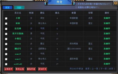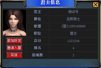 在外交界面,玩家可以看到好友的各种基本信息,譬如性别、爵位、排名、所在联盟,以及在联盟当中的职位。如果玩家希望了解到朋友跟详细的信息,可以在好友列表当中点击玩家的名字,在弹出的窗口当中,玩家可以进一步地了解好友的信息,包括玩家的总分以及基地数。同时可以进行邀请入盟和写邮件的操作。