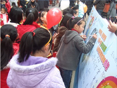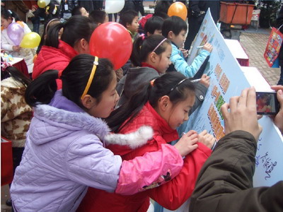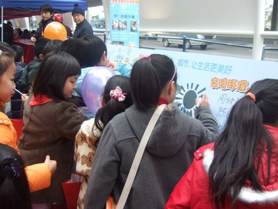 百万儿童点亮彩虹的主办公司上海酷噜网络科技在上海动漫街摆开了一个超过3米的“支持环保,点亮彩虹”签名墙,1天之内就有超过2万儿童在这个祝贺墙上签字,并形成排队长龙,体现了环保、公益及世博海宝的强大号召力。