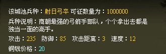 射日弓是上古十大神器之一,相传为后羿所有,具有九连射之奇技,威力四射,即便无箭亦能伤人。《淮南》言尧时十日并出,草木焦枯,尧命羿仰射十日,中其九日,日中九乌皆死,坠其羽翼,故留其一日也。射日弓卒是商朝最强的弓箭手部队,射程极远,射法神准,杀伤力很强,个个拿出去都是能够独当一面的高手。每招募一个该兵种,需要战绩值:5。
