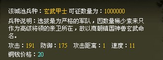 玄武甲士是商朝中选拔最为严格的军队,因数量稀少素来只作为高级将领的亲卫所在,他们经验丰富、修为极高,身穿坚硬的护甲,有极强的防御能力。在近距攻击中,有很强的杀伤力,是战场中的王者。每招募一个该兵种,需要战绩值:5 。