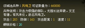 凤鸣卫是攻击力极强的部队,尤其擅长长途奔袭,且有很高的防御力,综合实力顶尖,是战场上令人闻风丧胆的传奇兵种。有凤鸣卫之相助,如有凤来仪,所向披靡。每招募一个该兵种,需要战绩值:5 。