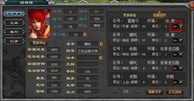选择完自己的神仙之后,就可以选择自己的对手了。在选择对手界面中,除了可以查看对手的姓名、等级、职业之外,只要点击对手右边的“眼睛”按钮还可以查看到对手的装备,选择合适自己的对手是获得荣耀的必然之路。