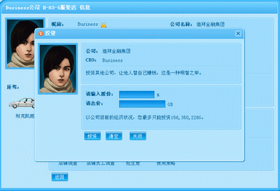 在对方公司界面点击“选择投资”按钮进入投资界面,输入股份比例和购买出价后点击“投资”按钮,给对方董事长发送本次投资申请,等待对方的回复。