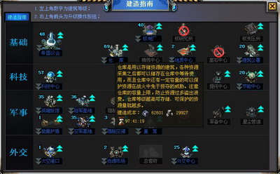 在建筑指南内,将玩家所能够建造的28种建筑分为4类:内政、科技、军事、外交。玩家可根据当前基地的发展趋向了解还有哪些建筑可以建造并升级,尤其针对科技城与军事城,玩家可以对科技中心、提纯中心、军备中心等关键建筑的升级情况进行快捷的了解,非常方便。