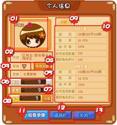 角色生涯:包括竞技生涯和冒险生涯;竞技生涯和冒险生涯分别记录了您在对战模式和怪物模式中的战况,胜率,命中率等;