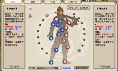 打通经络之前,需要选择一个自己主修经脉,剑、拳、暗器、医疗,根据个人喜好选一个点进去,就会看到自己的职业需要修炼的经脉。下图以剑系为例。