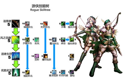 游侠:常规远程物理输出职业,也具备普通的近战输出能力,攻击范围、攻击速度和良好的机动性是游侠的优势。可转职为侧重远程物理输出和野兽控制的猎人,或侧重近战物理输出的盗贼。