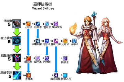 巫师:常规法系输出职业,巫师的远程法术伤害可以弥补自身生存能力的不足。可转职为侧重群体法术伤害的元素师,或侧重法术辅助的秘法师。