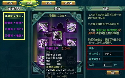 声望装备主要分为40级、60级、80级、100级,与顶级橙色装备的类型一样,分为“刃、固、力、灵”四种,玩家可以点击要兑换的目标装备,并花费相应的声望值和选择兑换数量,便可以获得80%~~100%随机品质的声望装备部件。