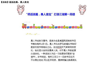 愚人节虽然名称中带有一个“愚”字,但在此处并不是愚蠢的意思,只不过是大家互相开开玩笑、搞搞恶作剧,就是为的开心一下。既然要开心,那就有许许多多的方式了,在这个快乐的节日,《江湖》给大家来了三大好玩的活动,伴您度过一个快乐的愚人节。