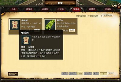 《三国演义之天策》的商城系统集合了各种作用、各种类型的丰富道具,有醒目的热卖、特殊类、资源类、时间类、军事类、将领类和材料类。现在,就让我们一起揭开它神秘的面纱,看看这些宝物如何为我们所用,如何在战场上成为我们的致胜法宝。