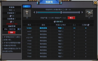 2.在核电厂中消耗核能为基地供电。消耗的核能越多提供的电力越充足。核能可以通过掠夺7大资源基地NPC、分配工人在核能场进行采集核能等方式获得。