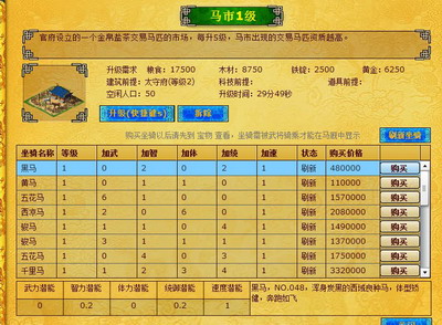 在瞬息万变的战场上,**往往稍纵即逝.也许差一分,便来不及援救盟友,也许差一秒,就被敌人完好的逃离了攻击范围.更快的坐骑给予了军队更高的机动性,可将战术的意外减到最低,更使你牢牢把握战局的主动权.即使敌军发动袭击,只要你拥有了更高的移动速度,千里奔袭敌军老巢,后发先至赢得胜利的"三国传说",也将成为现代事实.